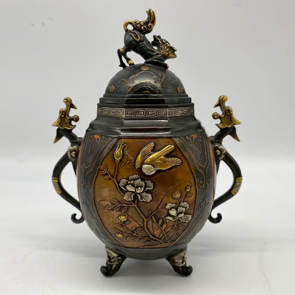 大峰造 高岡銅器 銅製象嵌 麒麟摘双龍耳 花鳥文 三足香炉【買取実績紹介】