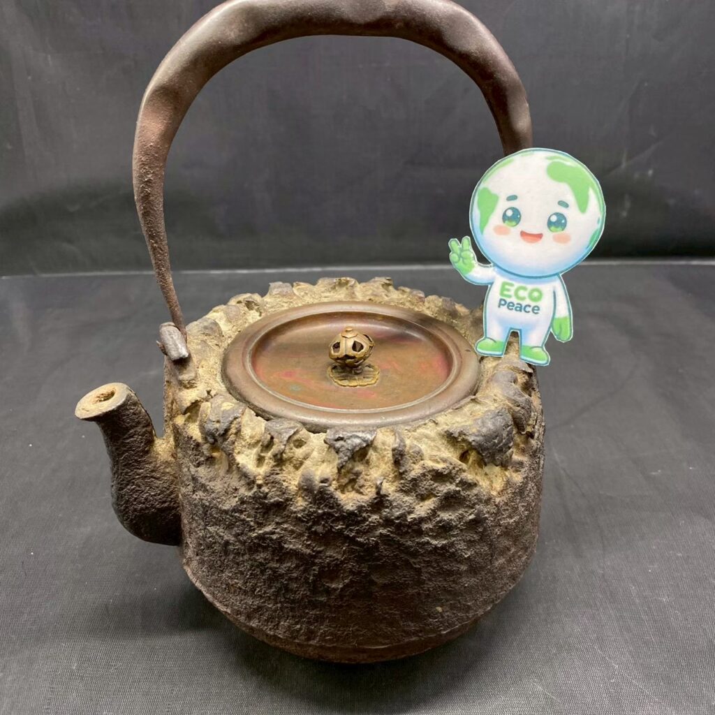こちらのお品は、重厚感のある丸形の鉄瓶で、荒々しくも趣のある鋳肌(いはだ)が特徴的な一品です。蓋には繊細な摘みが施され、全体のバランスも美しく、時代を感じさせる佇まいが印象的でした。経年による錆や変色は見受けられましたが、それもまた骨董品としての味わいであり、大きな割れや水漏れなど致命的なダメージはございませんでした。