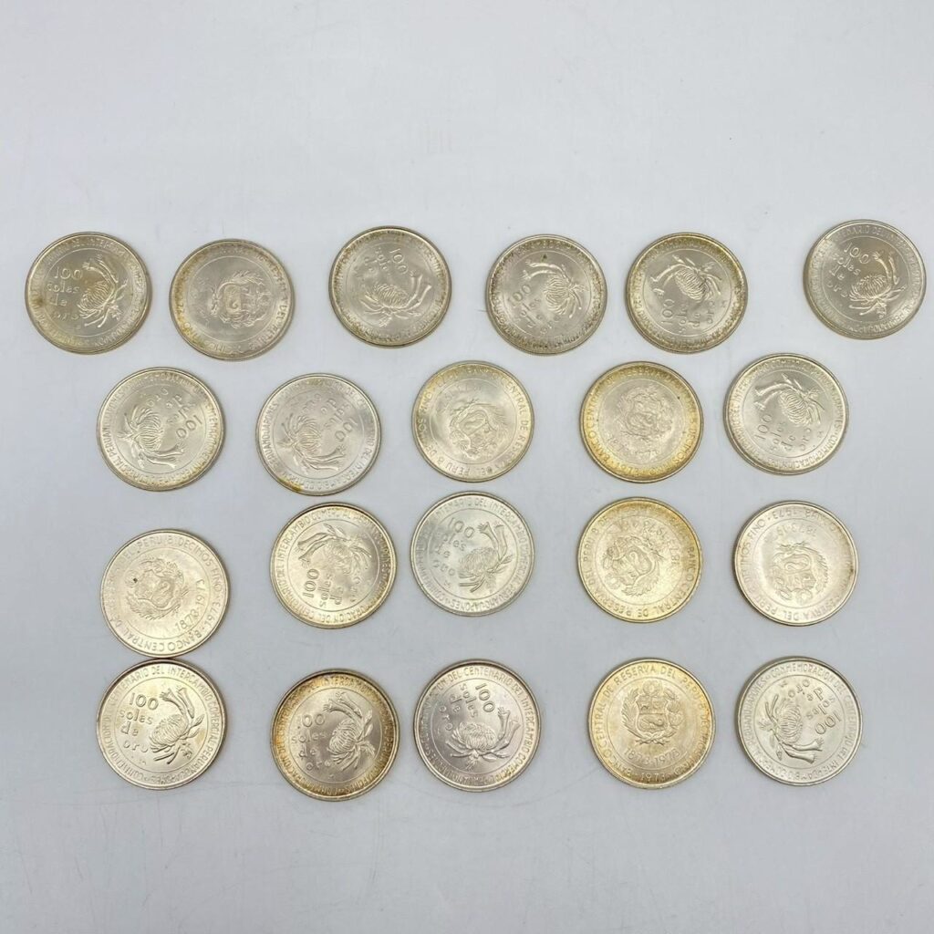 ペルー中央準備銀行が発行した「100ソレス・デ・オロ 記念硬貨」21枚セットの紹介です。写真にある通り、表面には国章、裏面には美しい植物のレリーフが刻まれた、存在感のある外国記念硬貨コレクションです。発行から年月が経っているものの、全体的に状態が良く、コレクター需要の高いシリーズとなっております。
