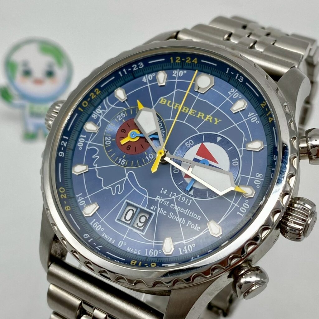 ブルーを基調としたダイヤルに、クロノグラフ機能・デイト表示・GMT表示(24時間表記)を備え、視認性と機能性を両立。ステンレススチールケースとブレスレットの組み合わせにより、重厚感と高級感のある仕上がりです。ファッション性が高く、BURBERRY(バーバリー)の中でも人と被りにくいデザインの腕時計として評価されやすいモデルです。
