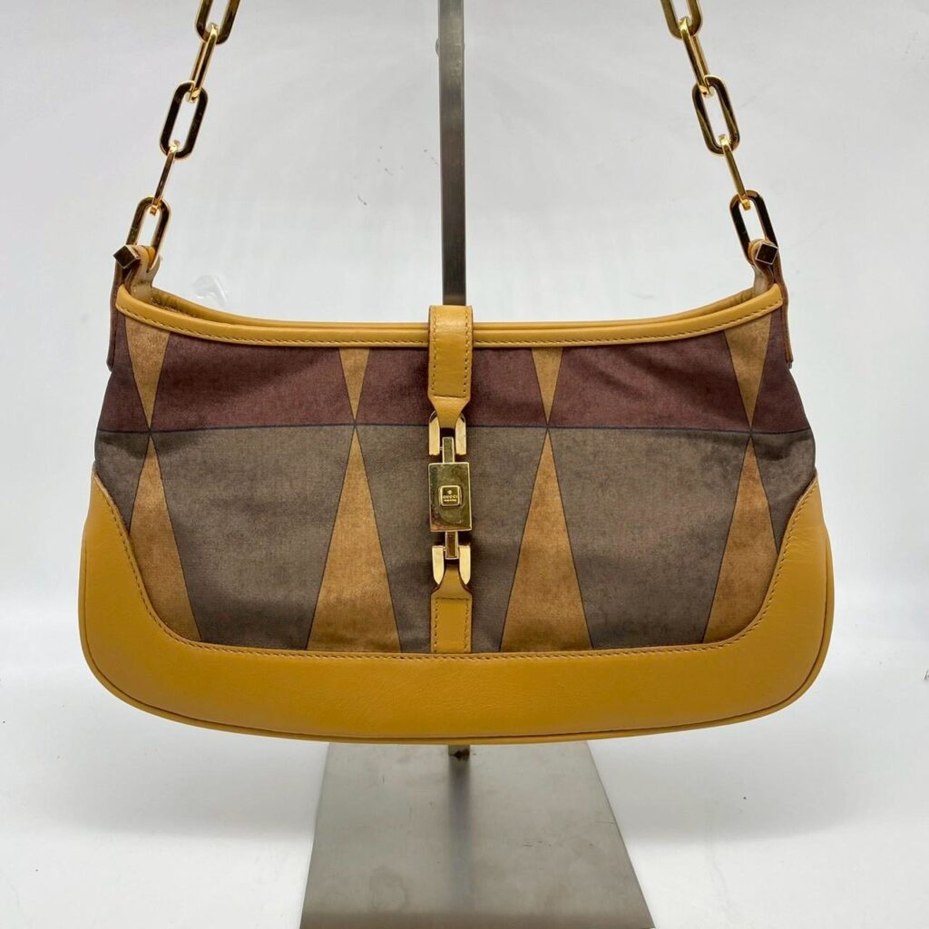 GUCCI(グッチ)の名作ラインとして長年愛され続けている「ジャッキー(Jackie)」ハンドバッグのご紹介です。ジャッキーは、ブランドを象徴するホースビットや独特の金具デザインが特徴で、上品さと遊び心を兼ね備えたモデルとして人気が高いシリーズです。こちらのお品物は、幾何学柄のキャンバスとイエロー系のレザーを組み合わせた希少なデザインで、ファッション性の高さが際立つ一本でした。