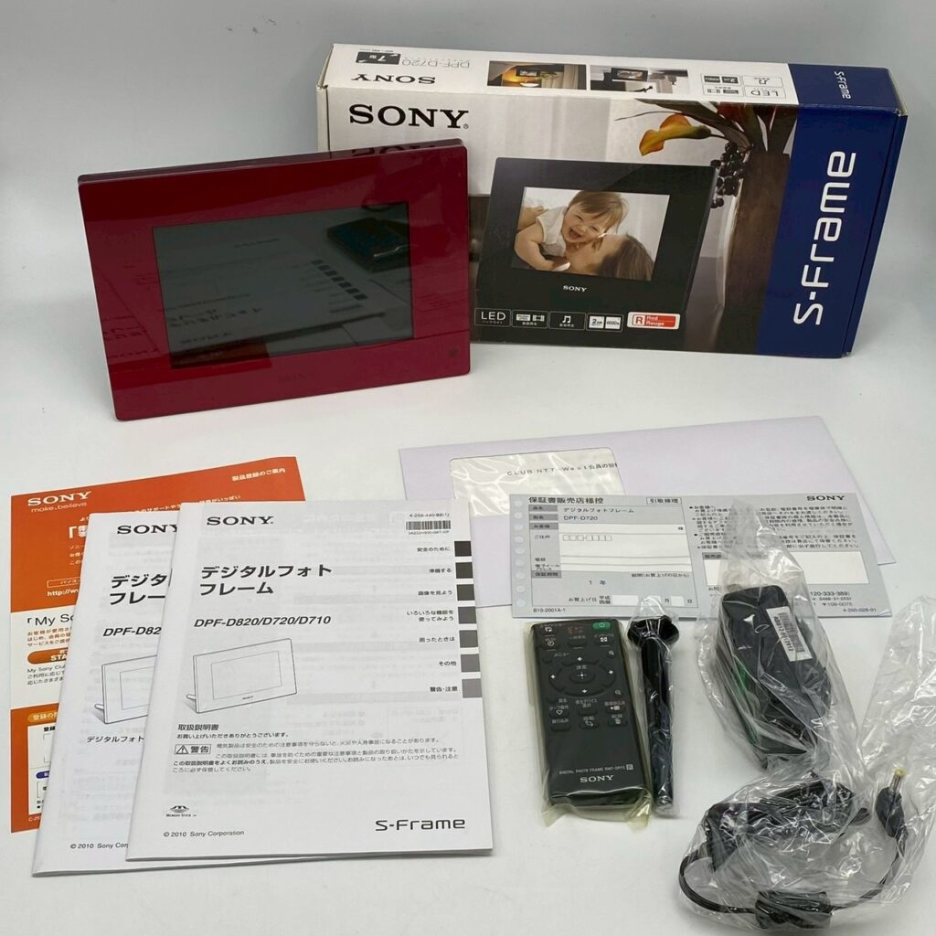 付属品には、元箱・取扱説明書・リモコン・電源ケーブルが揃っており、使用感の少ない状態は中古市場でも評価されやすいポイント。SONY(ソニー)製デジタルフォトフレームは生産終了モデルも多く、近年は「SONY デジタルフォトフレーム」「S-Frame 買取」「DPF-D720 中古」といった検索ニーズも高まっています。